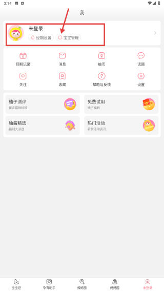 1、打開育兒記錄應(yīng)用,點擊底部未登錄選項,進入個人中心頁面。