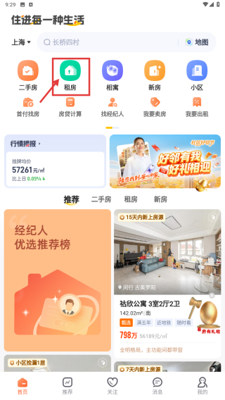 1、打開房產(chǎn)租賃應(yīng)用,點(diǎn)擊首頁(yè)租房選項(xiàng),進(jìn)入租房頁(yè)面。