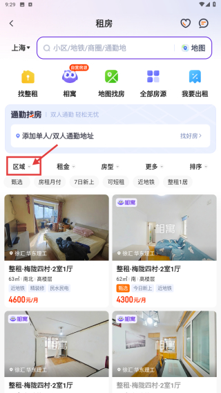 2、在租房頁(yè)面,點(diǎn)擊區(qū)域篩選條件,進(jìn)入?yún)^(qū)域篩選界面。