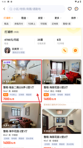 4、篩選完成后,即可查看打浦橋商圈下的租房房源列表,如整租·瑞金二路225弄2室1廳等房源信息。