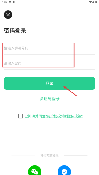 4、在手機號密碼登錄頁面,輸入手機號和密碼后點擊登錄按鈕,完成賬號登錄操作。