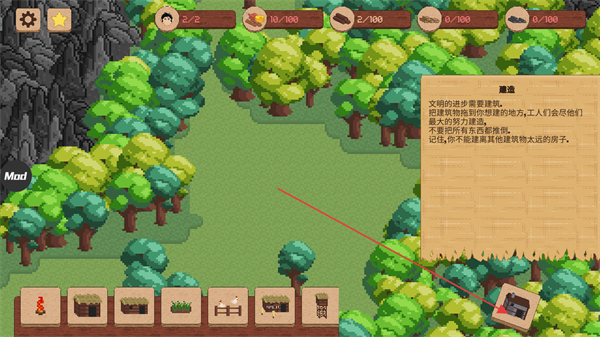 1、了解建造功能,通過(guò)建造建筑推動(dòng)文明進(jìn)步,工人會(huì)處理建造物附近資源。
