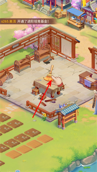 4、在場(chǎng)景互動(dòng)環(huán)節(jié),根據(jù)指引點(diǎn)擊掃帚等互動(dòng)道具,這是場(chǎng)景探索的基礎(chǔ)操作,互動(dòng)后可解鎖新區(qū)域或獲取資源。