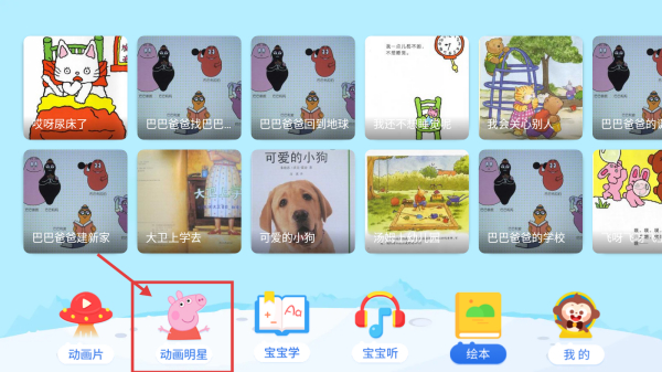 1、打開(kāi)兒童動(dòng)畫(huà)類(lèi)應(yīng)用,點(diǎn)擊底部動(dòng)畫(huà)明星選項(xiàng),進(jìn)入動(dòng)畫(huà)明星選擇頁(yè)面。