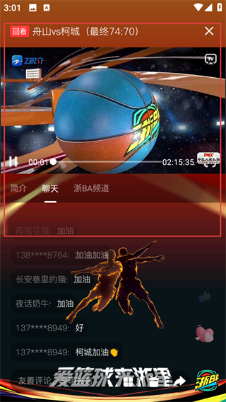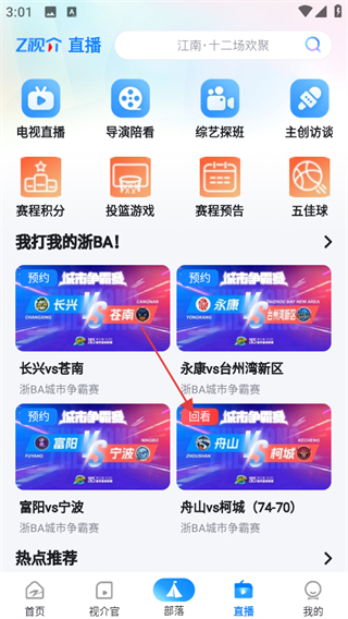 3、在回看播放頁(yè)面,可觀看舟山vs柯城的浙BA城市爭(zhēng)霸賽直播回放內(nèi)容。