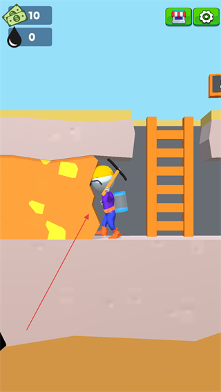 1、操控角色用鎬頭開采黃色礦石,積累礦石和金錢,提升開采能力。