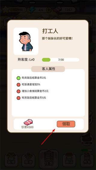 4、提升顧客熟客度,領(lǐng)取獎(jiǎng)勵(lì),積累資源,助力餐廳設(shè)施升級(jí)和餐品研發(fā)。