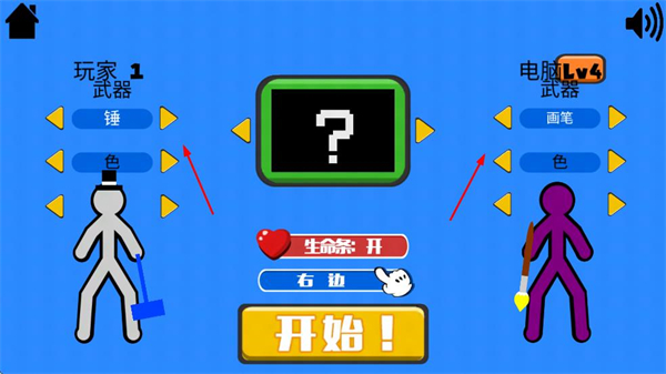 2、在準(zhǔn)備界面,玩家可調(diào)整自身武器和顏色,同時(shí)留意電腦對(duì)手的武器及等級(jí),做好對(duì)戰(zhàn)準(zhǔn)備。
