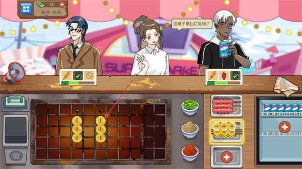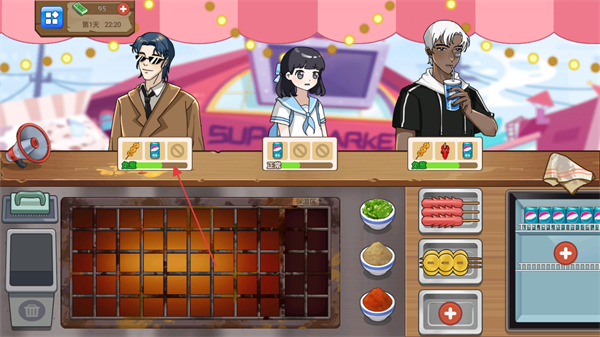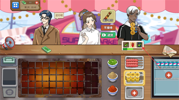 3、顧客支付金幣后收集,食材不足時點擊進貨補充,同時可選擇是否接待特定顧客。