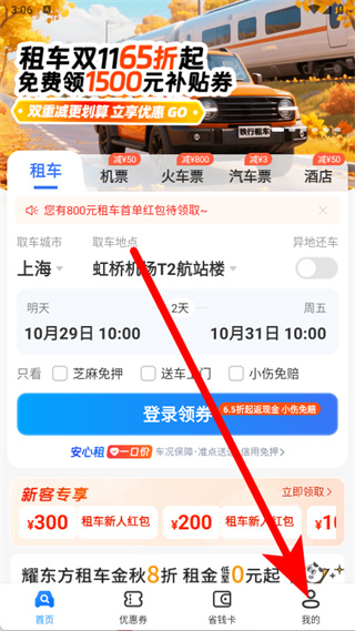 1、打開(kāi)鐵行租車(chē),點(diǎn)擊底部導(dǎo)航欄的我的,進(jìn)入個(gè)人中心頁(yè)面。