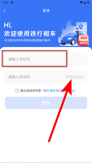3、在登錄界面,輸入手機(jī)號(hào)碼,點(diǎn)擊獲取驗(yàn)證碼。