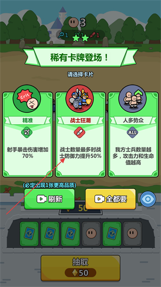 2、關(guān)卡挑戰(zhàn)前可以抽取角色屬性卡牌用于提升和人數(shù)增加調(diào)整。