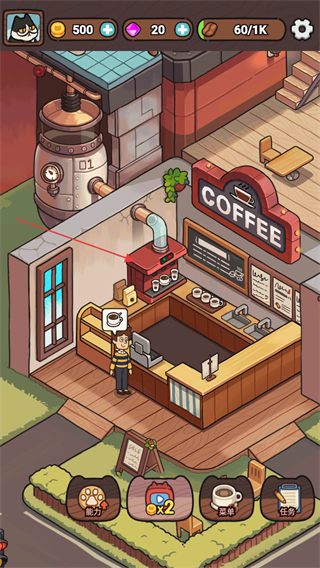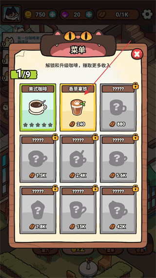 4、點擊右下角的菜單按鈕,可以花費咖啡豆獲取新的菜單飲品。