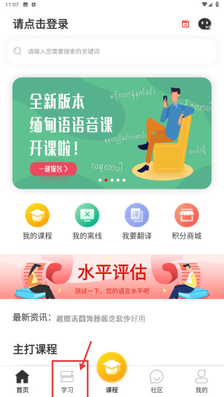 1、打開語言學(xué)習(xí)類應(yīng)用,點(diǎn)擊底部學(xué)習(xí)選項(xiàng),進(jìn)入學(xué)習(xí)分類頁面。