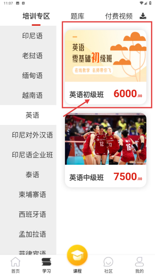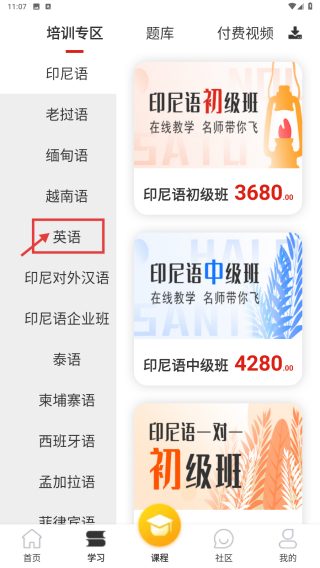 2、在學(xué)習(xí)分類頁面,點(diǎn)擊英語分類選項(xiàng),進(jìn)入英語課程列表頁面。