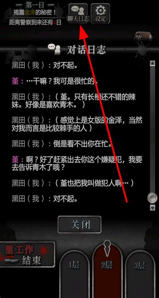 2、點(diǎn)擊聊天日志,仔細(xì)回顧與董、黑田等角色的對(duì)話內(nèi)容,從中挖掘關(guān)于金澤秘密的隱藏線索,梳理出劇情的發(fā)展脈絡(luò)。