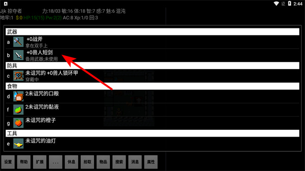 2、進入物品界面,查看并選擇武器如獸人短劍,合適的武器能提升戰(zhàn)斗能力,助力敵人。