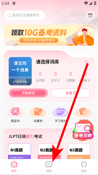 1、打開日語單詞查詢,點擊底部導(dǎo)航欄的課程,進入課程頁面。