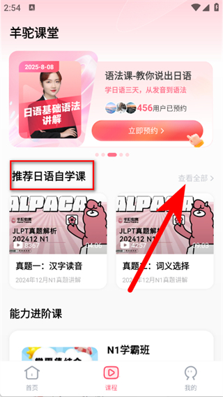 2、找到推薦日語自學(xué)課板塊,點擊查看全部,進入全部課程列表。