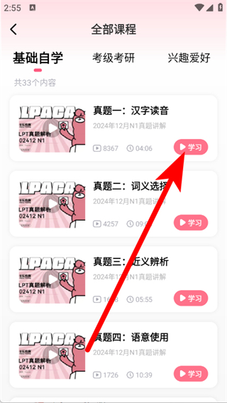 3、在全部課程列表中,選擇目標課程,點擊課程右側(cè)的學(xué)習(xí)按鈕。