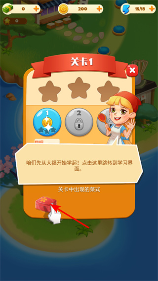 1、在關(guān)卡選擇界面,點擊提示的區(qū)域,可從關(guān)卡界面跳轉(zhuǎn)到學習界面,開啟新點心學習流程,制作點心奠定基礎(chǔ)。