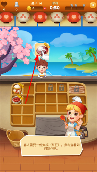 3、在經(jīng)營場景中,留意客人的點心需求提示,需要一份大福,點擊圖標可查看制作步驟,制作點心以滿足客人需求。