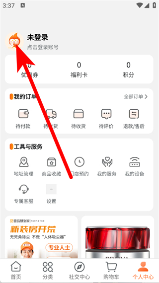 2、在個人中心頁面,點擊登錄賬號,進(jìn)入注冊登錄頁面。