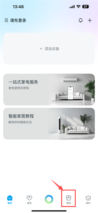 1、打開智能家居類APP首頁,點(diǎn)擊底部商城選項(xiàng),進(jìn)入商城頁面。