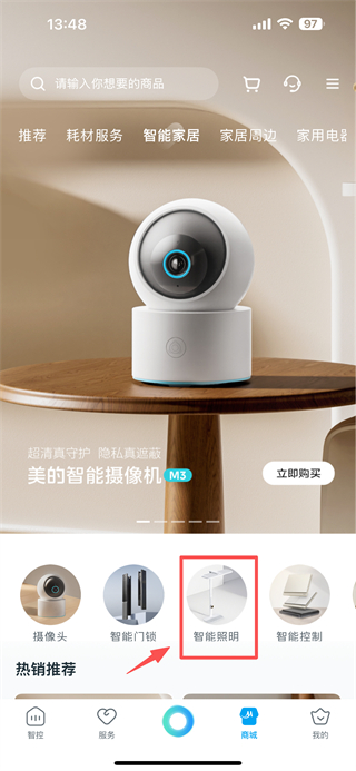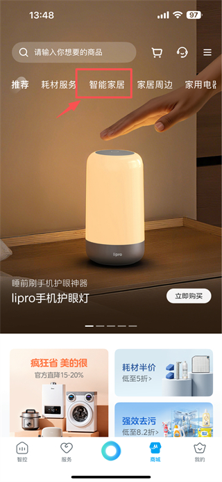 2、在商城頁面,點(diǎn)擊智能家居分類標(biāo)簽,進(jìn)入智能家居商品專區(qū)。