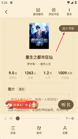 4、在小說詳情頁面,點(diǎn)擊加入書架,將小說添加到書架以便后續(xù)閱讀。