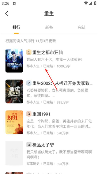 3、在重生小說列表頁面,點(diǎn)擊心儀小說如重生之都市狂仙,進(jìn)入小說詳情頁面。