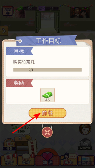 2、在工作目標(biāo)界面點(diǎn)擊前往按鈕,這是推進(jìn)任務(wù)進(jìn)度的核心步驟,點(diǎn)擊后可前往指定區(qū)域完成購(gòu)買竹茶幾任務(wù)。