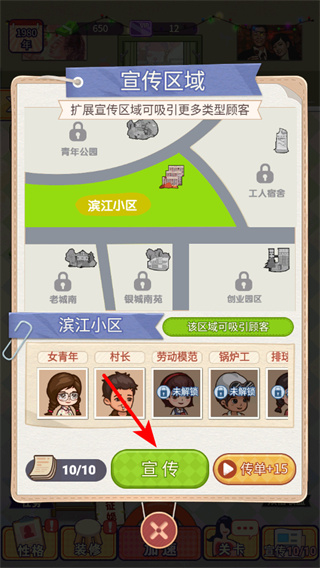 4、在宣傳區(qū)域點(diǎn)擊宣傳按鈕,拓展宣傳區(qū)域可吸引更多類型顧客,持續(xù)宣傳能不斷擴(kuò)大店鋪客源,提升收益。