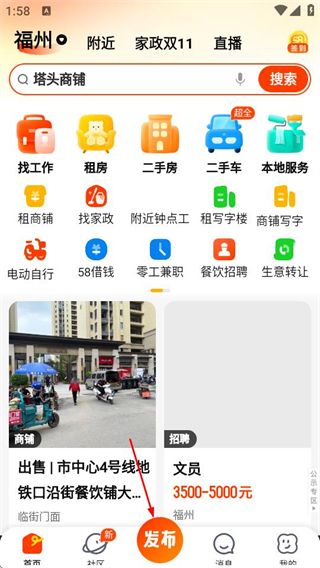 1、在58同城首頁,點(diǎn)擊底部發(fā)布選項(xiàng),進(jìn)入發(fā)布頁面。