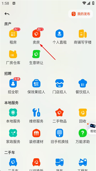 2、在發(fā)布頁面,選擇賣房分類,進(jìn)入我要賣房頁面。