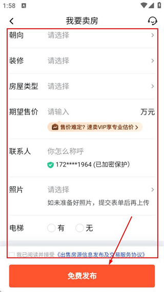 3、在我要賣房頁面,填寫信息后點(diǎn)擊免費(fèi)發(fā)布,可發(fā)布賣房信息。