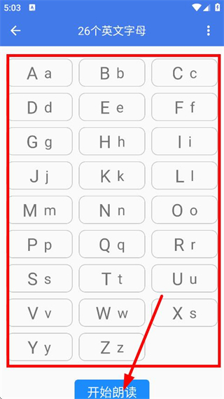 4、在26個英文字母頁面,點擊開始朗讀,開始學習英文字母。