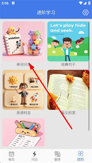 3、在進階學習頁面,點擊單詞分類,進入26個英文字母頁面。