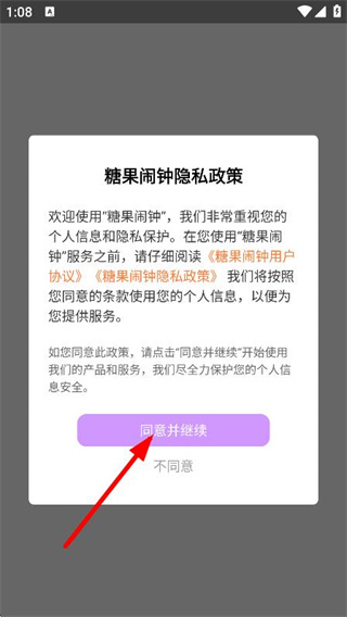 1、在糖果鬧鐘隱私政策彈窗中,點(diǎn)擊同意,進(jìn)入應(yīng)用主界面。