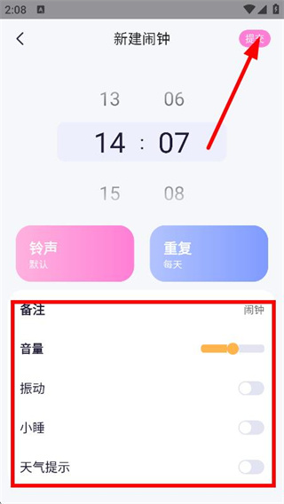 3、在設(shè)置時(shí)間、鈴聲、重復(fù)、備注等選項(xiàng)后,點(diǎn)擊提交,完成鬧鐘創(chuàng)建。