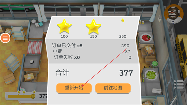 4、完成訂單后可獲得星星評價和金幣獎勵,點擊前往地圖解鎖新關(guān)卡,繼續(xù)挑戰(zhàn)。