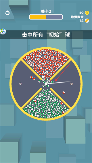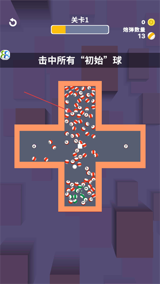 2、擊打到初始球后會(huì)炸出許多小球進(jìn)行不規(guī)律行動(dòng),利用他們的數(shù)量來(lái)完成關(guān)卡任務(wù)。
