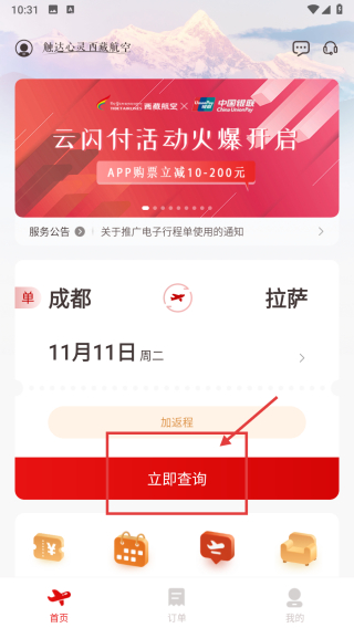 1、打開機票預(yù)訂類APP,在首頁點擊立即查詢按鈕,進入航班查詢頁面。