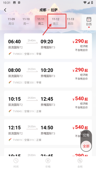 2、在航班查詢頁面,選擇11月12日周三的航班日期,篩選出當日航班列表。