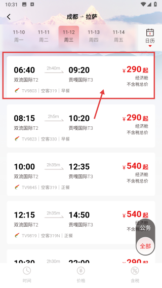 3、在航班列表中,點擊06:40起飛的航班,進入艙位選擇頁面。