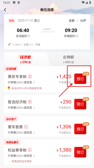 4、在艙位選擇頁面,點擊對應(yīng)艙位的預(yù)訂按鈕,完成航班艙位的預(yù)訂操作。