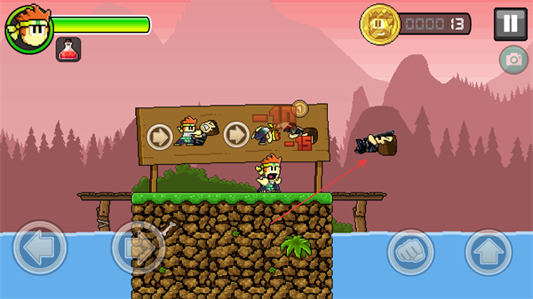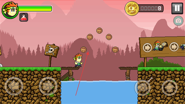 2、靠近敵人后攻擊,擊敗敵人獲取金幣,根據(jù)標(biāo)識牌提示推進(jìn)游戲。