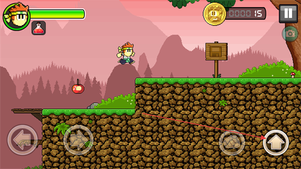 4、點(diǎn)擊跳躍按鈕,跳到高處平臺,收集蘋果等道具,推進(jìn)游戲進(jìn)程。