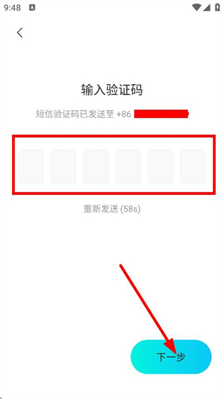 3、在手機(jī)號(hào)填寫頁面,輸入手機(jī)號(hào)后點(diǎn)擊下一步,進(jìn)入驗(yàn)證碼輸入頁面。