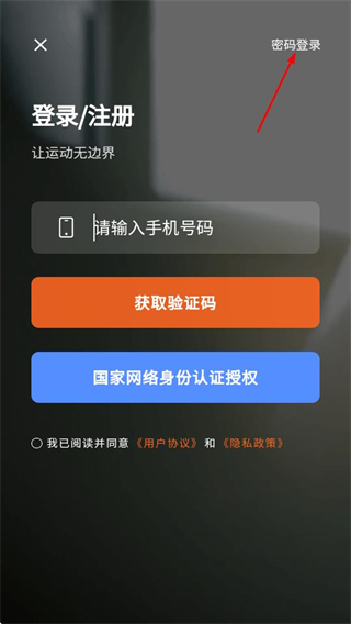 2、在登錄注冊頁面,點擊右上角密碼登錄選項,切換到密碼登錄界面。